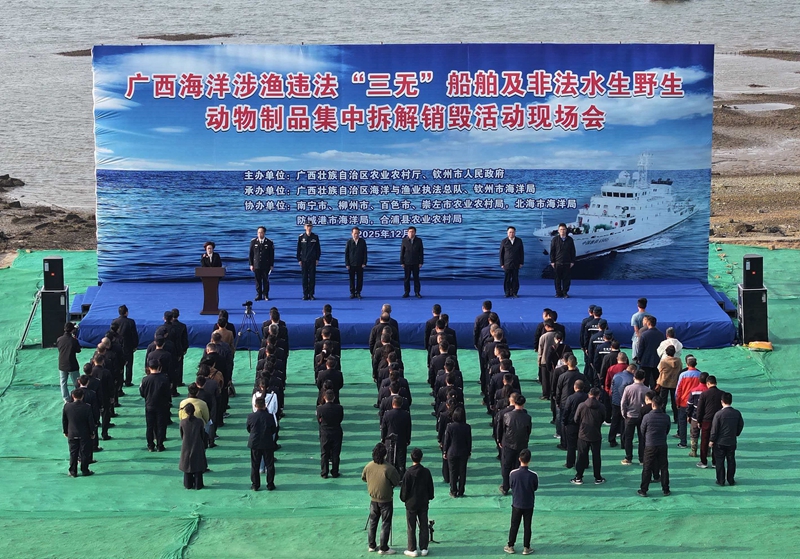 “今天在此隆重举行广西海洋涉渔违法‘三无’船舶及非法水生野生动物制品集中拆解销毁活动,是贯彻落实海洋渔船安全生产专项整治、渔业生态环境保护以及涉边违法犯罪综合治理有关工作部署的一次具体‘亮剑’行动,也是持续深入推进海洋‘三无’船舶问题专项治理的再动员再部署”,活动相关负责人在现场会上表示。