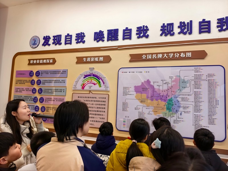 随后,在教师们的带领下,大家参观了学生成长中心。活动中,现场教师结合生涯规划启蒙开展分层提问,引导亲子共思共答,助力小初高衔接与成长启蒙。