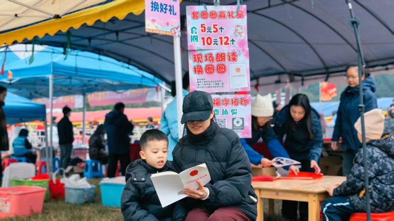 在暖阳之下,市集现场人气鼎盛、暖意融融,各个活动区域联动发力、热闹非凡,处处洋溢着浓厚的阅读氛围和乡村烟火气。套圈游戏区前,男女老少在此排起了长长的队伍,大家手持套圈,瞄准心仪的礼品,成功套中图书、积木时,喜悦欢呼声此起彼伏。免费“福”字拓印体验区,群众亲手制作“福”字,感受传统文化与阅读的深度融合。文创图书展销区推出“全场图书75折、购满39元送礼”惠民政策,精选优质图书与本土读物整齐陈列,涵盖科普知识、文学经典、生活实用等多个品类,深受村民的青睐,掀起了一波购书、读书的热潮。朗读声、欢笑声、交流声、挑选书籍的沙沙声交织在一起,勾勒出一幅“人人爱读书、处处有书香”的全民阅读新画卷。