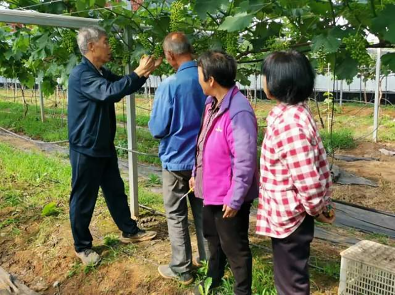 在露天葡萄种植区,针对户太8号葡萄管理,李灿提出管理建议:一是花前摘心,在果穗上面留5叶摘心;二是定穗,一般每枝一穗葡萄,保留方便操作的外面果穗;三是除副梢。他讲得认真,果农们听得也仔细,把他讲解的要点一一记在了心间。