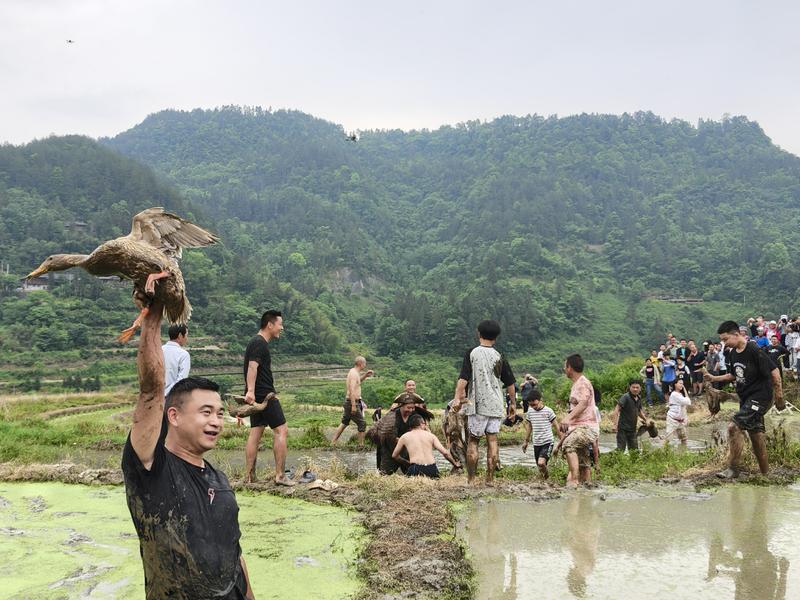 除了插秧比赛,“浑水摸鱼”、稻田捉鸭同样精彩纷呈。稻田里鱼儿嬉戏、鸭群撒欢,游客们放肆奔跑、你追我赶。纵使满身泥浆,依旧劲头十足、乐此不疲,实实在在感受到泥土带来的欢乐。
