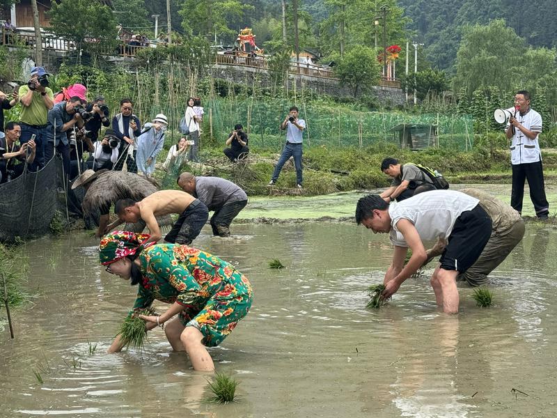 “吉时到,开秧咯!一开风调雨顺,二开五谷丰登,三开国泰民安……”伴随“秧官”的声声祝福,村民们打起腰鼓、喊起号子,祭土地、拜秧神,活动在“开秧门”的仪式中拉开序幕。
