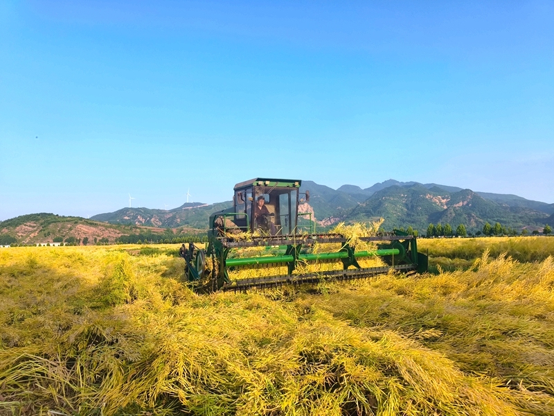 一排排饱满的油菜豆荚连着秸秆收割机卷入“肚中”,经过机器运转“消化”,油菜籽脱壳分离储存,秸秆则被粉碎排出,均匀地撒回田地,成为生态肥料。不一会儿工夫,金黄的油菜籽从收割机的卸粮口流出装车,统一运输到集中晾晒点。今年,稻田小镇油菜种植面积达1200亩,预计可收获油菜籽30万斤,产值约90万元。