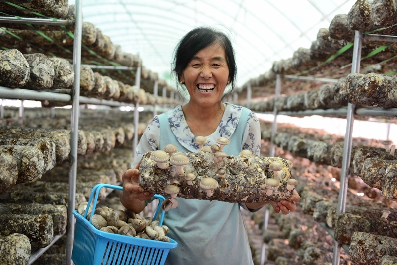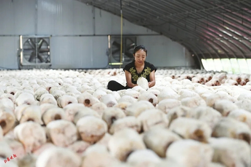 村民在蘑菇大棚工作