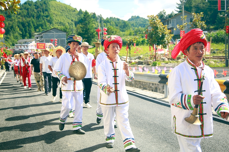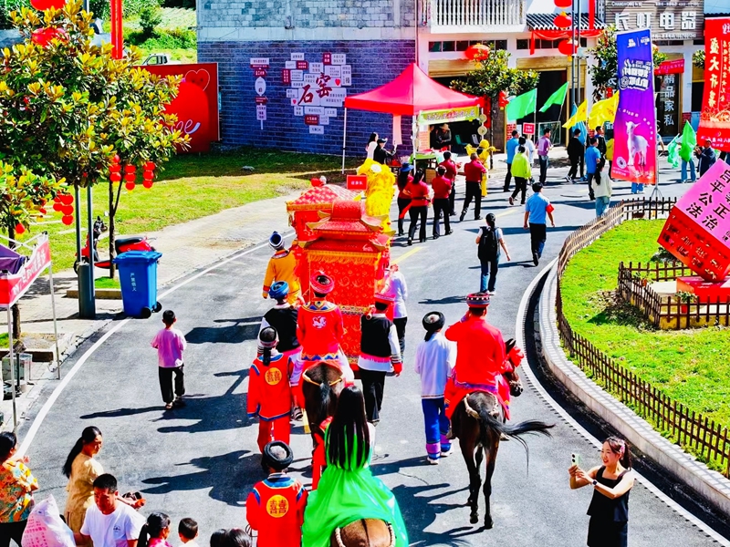 上午9点30分,一支由花轿、嫁妆、马匹和特色农副产品展示等组成的巡游队伍从石窑村文化广场出发,百余名村民身着土家服饰、漂亮新衣,背背篓、挑山货,在锣鼓声中开启盛大的民俗巡游。
