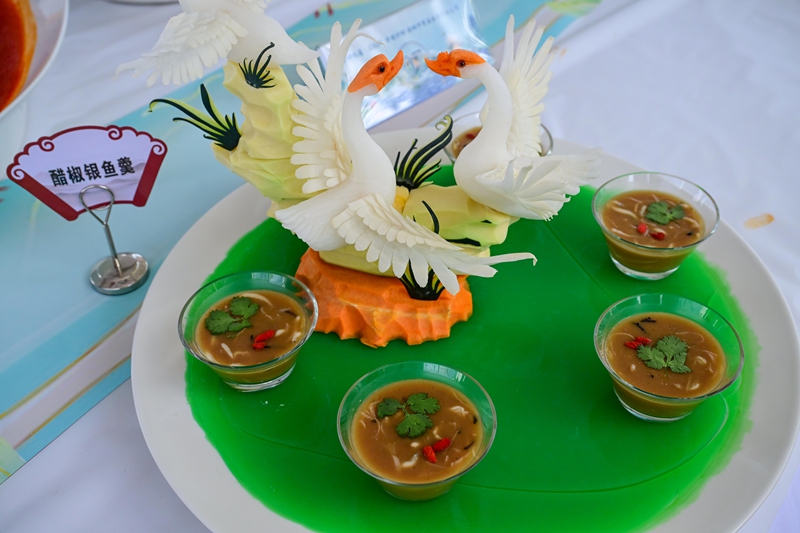 来自汝阳瑞云国际大酒店的主厨李行行则推出富有诗意的菜品“一叶浮萍”。在一只小瓷盅里,莲蓬与莲藕漂浮在清汤中。据李行行介绍,莲藕是竹笙包裹鱼蓉做成,而莲蓬则是鱼糕加入菠菜汁,造型成莲蓬后再嵌入青豆。“这道菜不仅造型精美,更体现了‘鱼文化’的诗意之美。”李行行说。