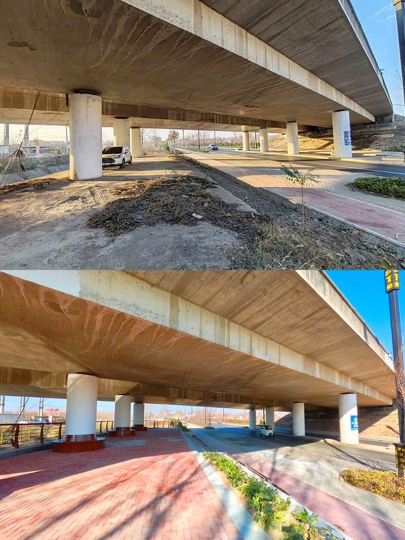 在空间利用上,把原来法庭门口小草坪改造升级成一个精致的口袋游园,设置木质廊架、休闲座椅,搭配错落的绿植,既增添了颜值,又丰富了居民的休闲生活。将高速桥下的闲置区域打造成兼具休闲与景观的小空间,硬化地面,增设护栏、座椅,让昔日的“边角料”变成居民歇脚的好去处;在道路提升上,对主干道西出口进行拓宽升级,铺设红色休闲步道,原本单一的行车道旁,新增了便民慢行空间,让通行体验焕然一新。