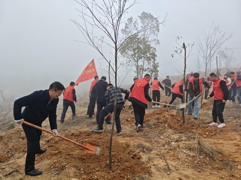 植树现场,党旗飘扬、干劲满满。大家分工协作、默契配合,挥锹挖坑、扶苗扶正、培土压实、提桶浇水,每一个环节都细致认真、井然有序。党员干部带头示范,志愿者踊跃参与,以饱满的热情投身劳动,用双手为家园播撒绿色希望。经过一上午的辛勤劳作,一棵棵樟树、榉树迎风挺立,300株新绿错落有致,为村庄披上了清新的绿装。