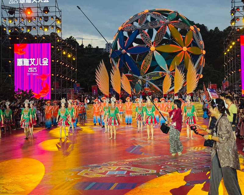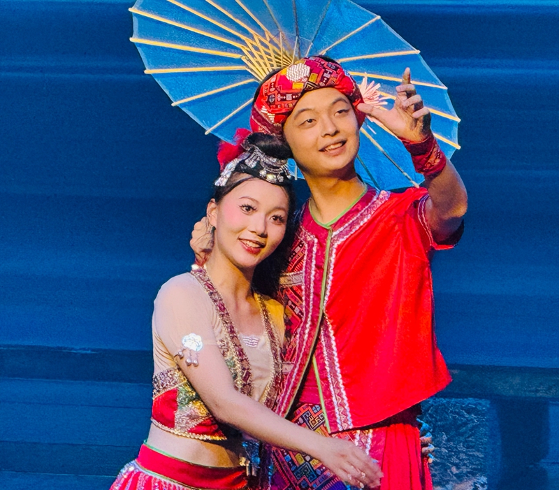 “浪漫山歌”、“梯玛祈福”、“女儿出街”三大篇章轮番上演,土家少男少女载歌载舞。两只象征幸福的七彩阳雀腾空而起,盘旋于流光溢彩的舞台。