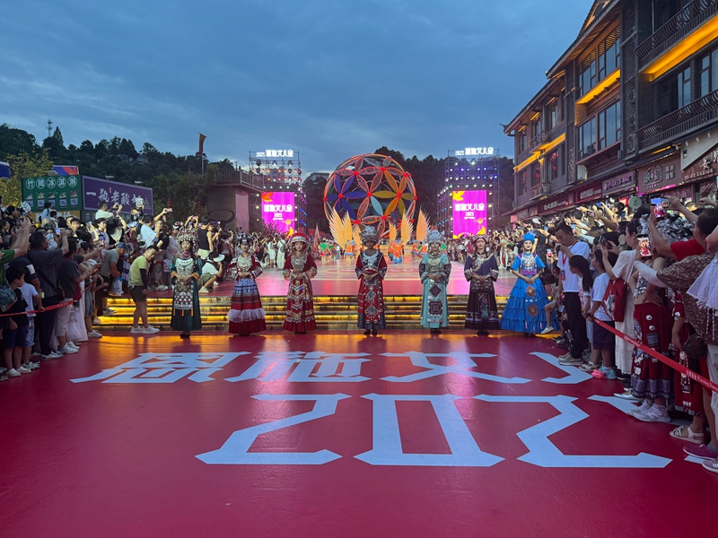 暮色渐深,含巴街吊脚楼灯笼高悬,化作情歌长廊。19时50分,赶场秀热闹开演。