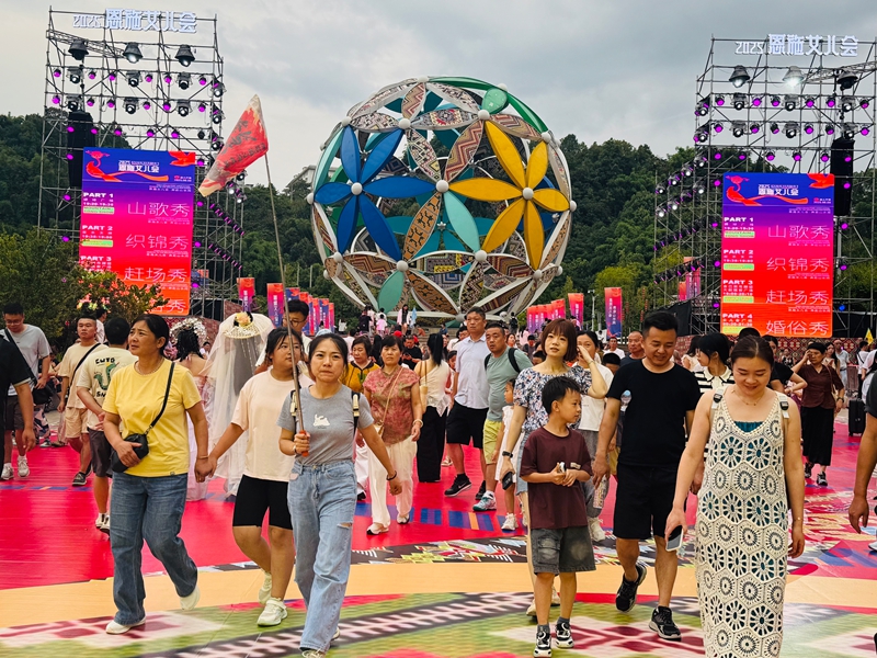 8月8日,日暮云霞渐行远,华灯初上醉游人。在湖北恩施土家女儿城景区绣球广场附近,近万名游客人头攒动、翘首以待,共同期盼着“同唱龙船调·情定女儿会”2025年恩施女儿会预热场活动开始。