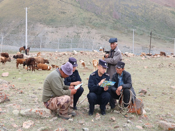 民警深入牧民定居点,与牧民面对面地沟通交流,通过发放传单、实地讲解等形式,重点围绕《新疆维吾尔自治区边境管理条例》《中华人民共和国治安管理处罚法》等法律法规中主要内容对牧民进行讲解宣传,教育引导牧民提高思想认识,要严格遵守边境管理法律法规,坚决杜绝发生人员越界违法案(事)件。针对牧民提出的其他方面的法律问题进行认真细致的解答,切实营造了良好的宣传氛围。