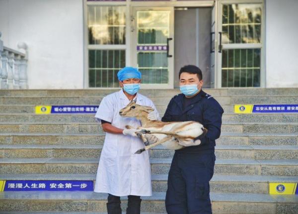 目前,该黄羊已移交至野生动物保护站做进一步观察治疗,待其伤势痊愈后放归大自然。