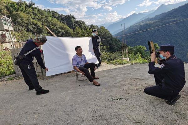 据了解,阿普父亲肯大爷因病残疾,双腿无法站立,行动十分不便,无法前往派出所拍摄身份证。“阿普,你先不要着急,我们马上上门为你父亲拍摄身份证!”随即,户籍民辅警准备好相机、背景布、指纹采集仪、补光灯等办证设备后,驾车来到阿普家中。张挂背景幕布、架相机、调试指纹采集仪等,民警迅速在阿普家门口搭起了“临时户籍窗口”。在经过与肯大爷沟通后,该所辅警认真为肯大爷整理衣服、纠正坐姿、调整面部表情,在一块临时背景墙前,民警迅速为肯大爷采集了身份证件照片。