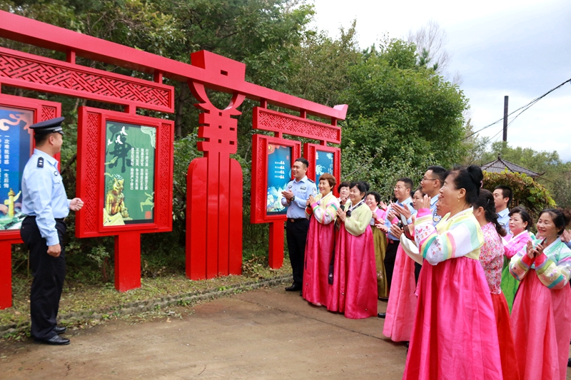 走进基地,“各族人民要像石榴籽一样紧紧地抱在一起 ”18个大字格外醒目,这便进入到了民族区。道路两侧排列着珲春地区主要少数民族风俗习惯、民族文化以及警民共建活动等展板。漫步民族区,一幅幅图片、一个个故事映入眼帘,让广大游客感受到了淳朴的民族风情和浓浓的警民深情。