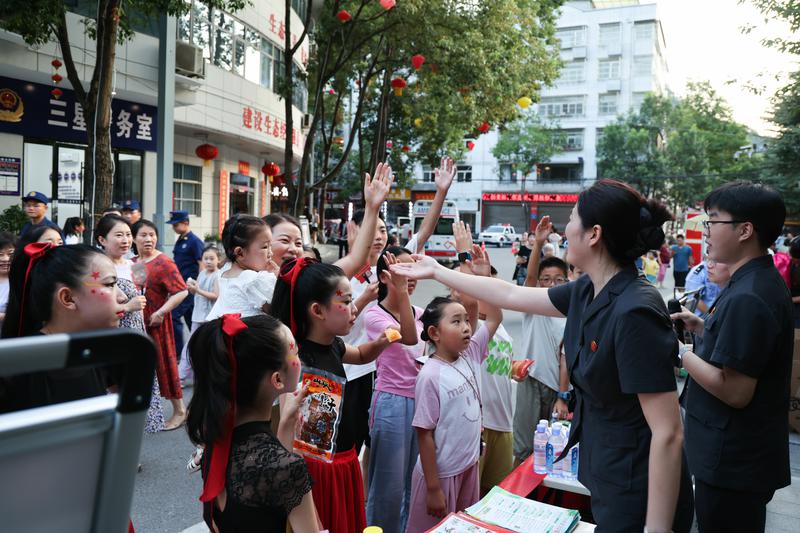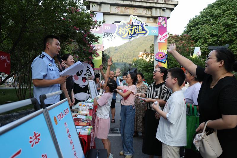 当日下午,在县城“村光大道”文艺晚会开始前,普法宣传接力展开。法院干警利用群众聚集等待的间隙,结合夜间消费、交通出行等实际场景,重点宣传了《食品安全法》《道路交通安全法》等法律法规,并倡导群众在参与活动时要自觉遵守公共秩序,共同守护宁陕的生态之美与人文之美。