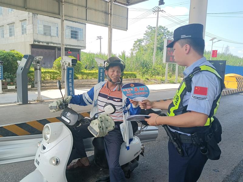 “您好,这扇子上印有举报偷渡的奖励政策和举报方式,请您了解一下……”8月28日,在广西崇左边境管理支队寨安边境检查站执勤点,执勤民警手持印有反偷渡宣传内容的便民扇,在烈日下为过往司机和乘客送上一抹抹“法治清凉”。