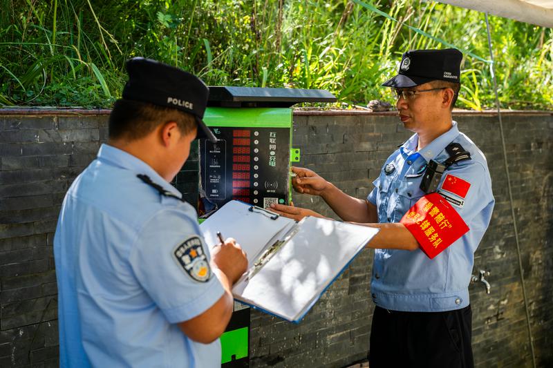 下一站是村口新设的电动车充电桩。这里是游客和村民日常聚集充电的地方,安全至关重要。濮用中仔细检查充电桩的防水罩是否完好、接地线是否牢固,又用手轻轻晃动充电枪,测试接口的松紧度。“别看这些设备新,日常维护跟不上,安全分分钟出问题。”他一边说,一边示意王伟伟注意观察充电桩周边环境。王伟伟打着手电,逐一检查线路槽盖是否严实、有无裸露线头,果然发现一处老化破皮。濮用中投来赞许的目光:“手电要慢扫、细看,光到哪,心就要到哪。老百姓把安全托付给这些设备,我们就得替他们把好每一道关。”