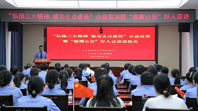 为大力弘扬大别山精神、抗洪精神、抗疫精神,引导全院干警感受“三大精神”的红色脉动,沐浴好人故事的道德之光,进一步涵养品德、振奋精神、担当作为,为推动“支点建设”贡献力量,9月5日上午,湖北省公安县人民检察院联合公安县新时代文明实践中心,开展“弘扬三大精神 建功支点建设”公益宣讲暨“德耀公安”好人宣讲进机关实践活动。该院党组副书记、副检察长张庆培主持活动,全体干警参会。