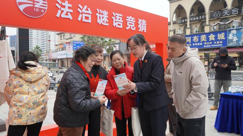 在“法治市集”服务区,检察干警为群众提供公益诉讼、未成年人保护等法律咨询,发放防范电信网络诈骗、宪法宣传册等手册200余份,现场解答群众疑问10余件。在“非遗法治”互动现场,检察干警与现场群众共同竞猜“宪法”、“民法典”、“长江大保护”等法律词汇谜面,与市民共同感受法治文化。