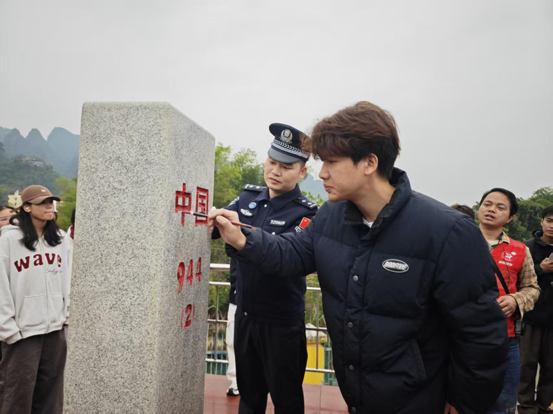 活动现场,水口边境派出所民警引领青年学子沿着边境线实地踏查,学子们亲身感受三江口的独特地理区位,深刻感悟守边护边、捍卫国土的重大意义。随后,一场庄严的界碑描红活动在界碑前有序开展,学子们手持画笔,凝神聚力、一笔一画,为界碑上的文字悉心描红添色。鲜红的色彩不仅勾勒出界碑的庄严轮廓,更浸润了每一位青年学子的心田,在心底深深镌刻下神圣的国土意识、炽热的家国情怀与坚定的家国担当。