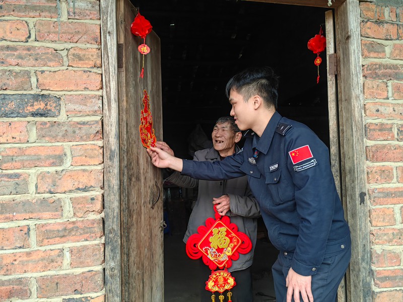 慰问不只是送达,更是陪伴与融入。民警小覃接过黄爷爷手中的灯笼,一边调整位置,一边唠着家常:“左边再高一点,这样更喜庆!”一老一少的身影,清脆的笑声,与刚刚贴好的年画、挂起的红灯交织在一起,浓浓的亲情与警民情,在这边境山村的冬日里悄然流淌、温暖人心。
