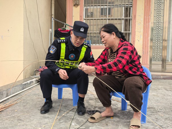 指尖编织的是传承,更是情谊与平安。民警在“学艺”间隙,主动为村民检查电路、排查用火隐患,笔记本上记满了大家的“急难愁盼”。警民间真诚的互动,让法治宣传在温馨的年俗氛围中自然流淌。