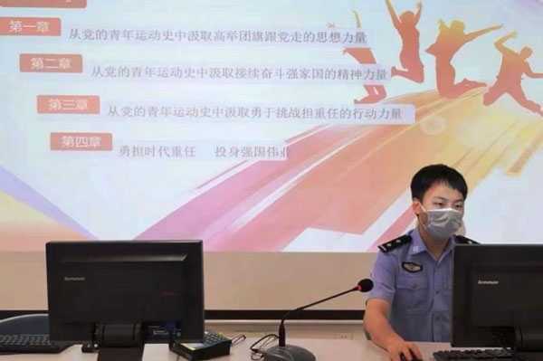 值此中国共产主义青年团成立100周年的历史性时刻,执勤一队党支部在深入学习党的青年运动史中,借助学习强国、共青团中央公众号等平台精心挑选推送相关学习内容,掀起民警自主学习热潮。同时,以多媒体授课的形式集中开展一堂主题学习,由青年民警骨干张林胜主讲,引导民警深刻了解党的领导下青年运动的百年历程;深刻认识只有始终坚持党的领导、拥护党的领导,广大青年才能找准方向;深刻感悟党领导下的青年运动“为什么出发”的初心使命、领会“怎样走到现在”的历史逻辑、明确“如何走向未来”的正确道路。为检验学习成果,该队还引入随堂考测机制,以考促学,进一步提升学习质量。
