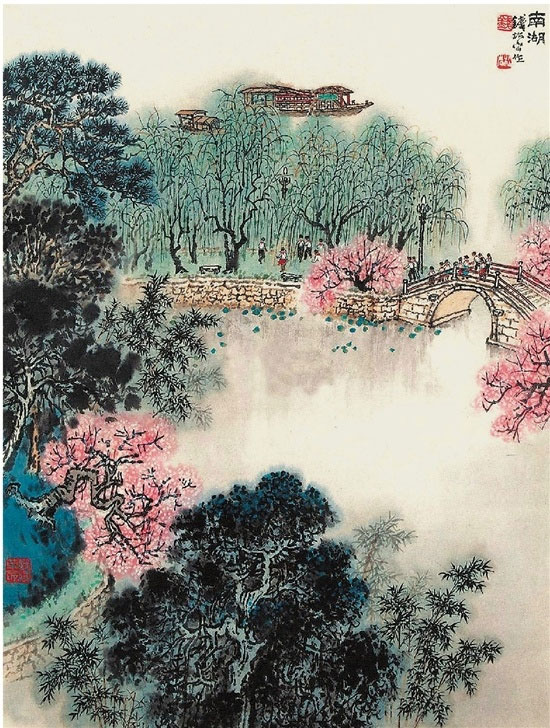 1977年,时年78岁的钱松喦老当益壮,精心构思并绘制的《南湖》,堪称同类作品中的精美典范。画面上,“红船”虽未占据主要位置,但高居画幅上端,起到了点题立意的作用。近景柏翠松苍,柳绿桃红,呈现出春暖花开下草木蓊郁的景象,并以淡彩渲染,衬托出天际微明、旭日初升的氛围,寓意中国革命的前程焕然一新,如花似锦。中景描绘了一群少先队员,在拱桥上结队走向神圣“红船”。整幅作品一改传统山水画恬淡宁静的表现手法,采用纵深开阔的鸟瞰式构图,以南湖“红船”为重点,由近到远、兼工带写,虚实相间、动静结合,水墨圆浑、苍润沉郁,色彩明艳、充满生机;写实中见抒情,抒情中显立意,凸显出江南文人画的意趣和情韵。