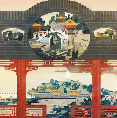北京地铁6号线北海北站壁画《北海揽胜》组画之《月中静心》《廊下琼华》,设计孙韬、田鲁、王长兴、李青。